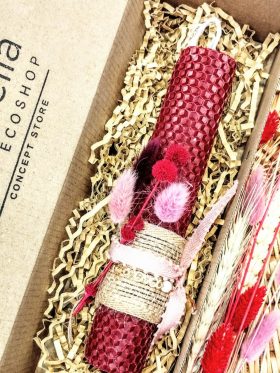 Κοντή Χειροποίητη λαμπάδα από φυσικό μελισσοκέρι. Χρώμα μπορντό διακοσμημένη με φυσικά αποξηραμένα άνθη και χειροποίητο βραχιόλι για την Νονά!