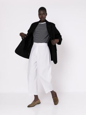 Βαμβακερό παντελόνι carrot fit με λάστιχο στη μέση. Ανάγλυφο βαμβακερό ύφασμα. Χρώμα λευκό.