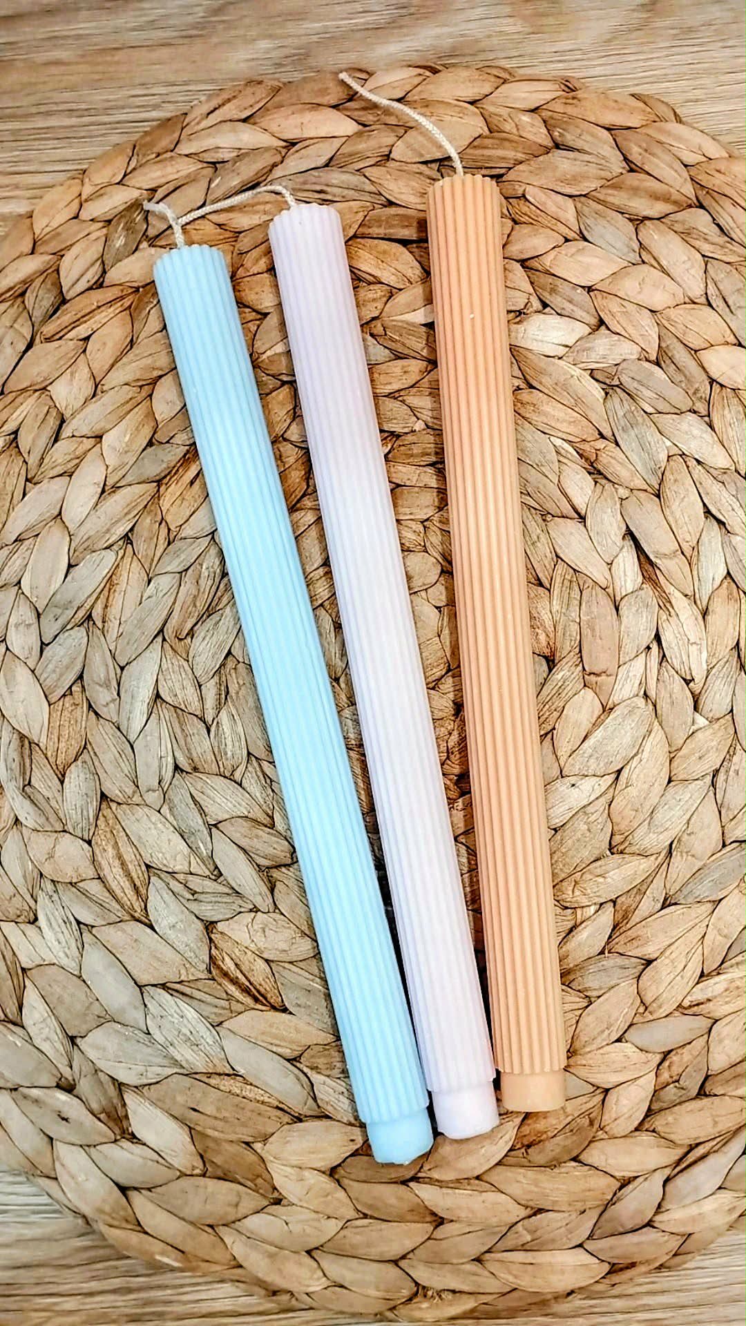Χειροποίητη ριγέ minimal λαμπάδα από φυτικό κερί, άρωμα τσουρέκι, σε τρια ανοιξιάτικα χρώματα.