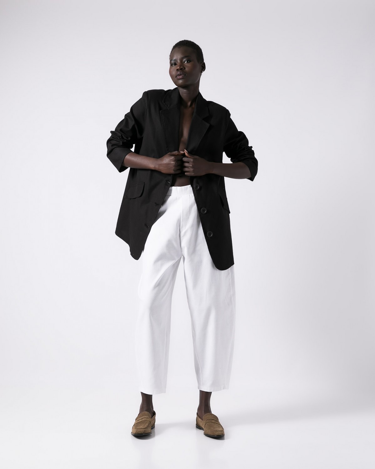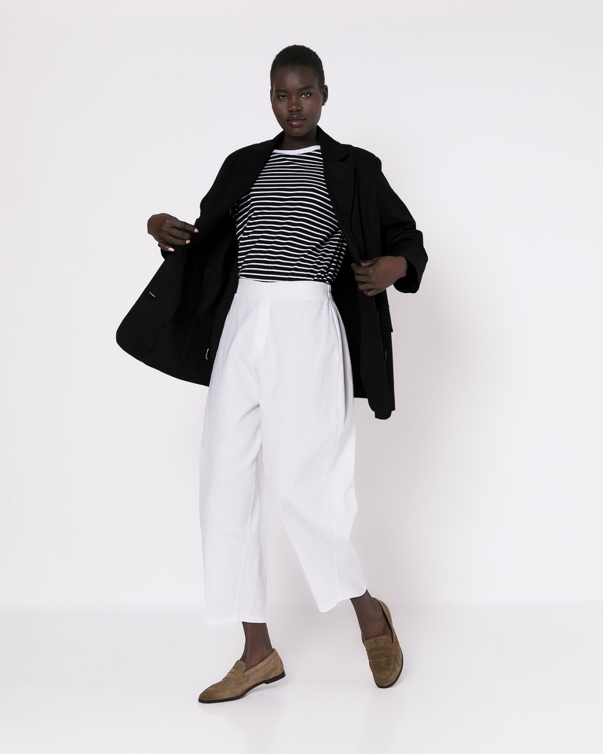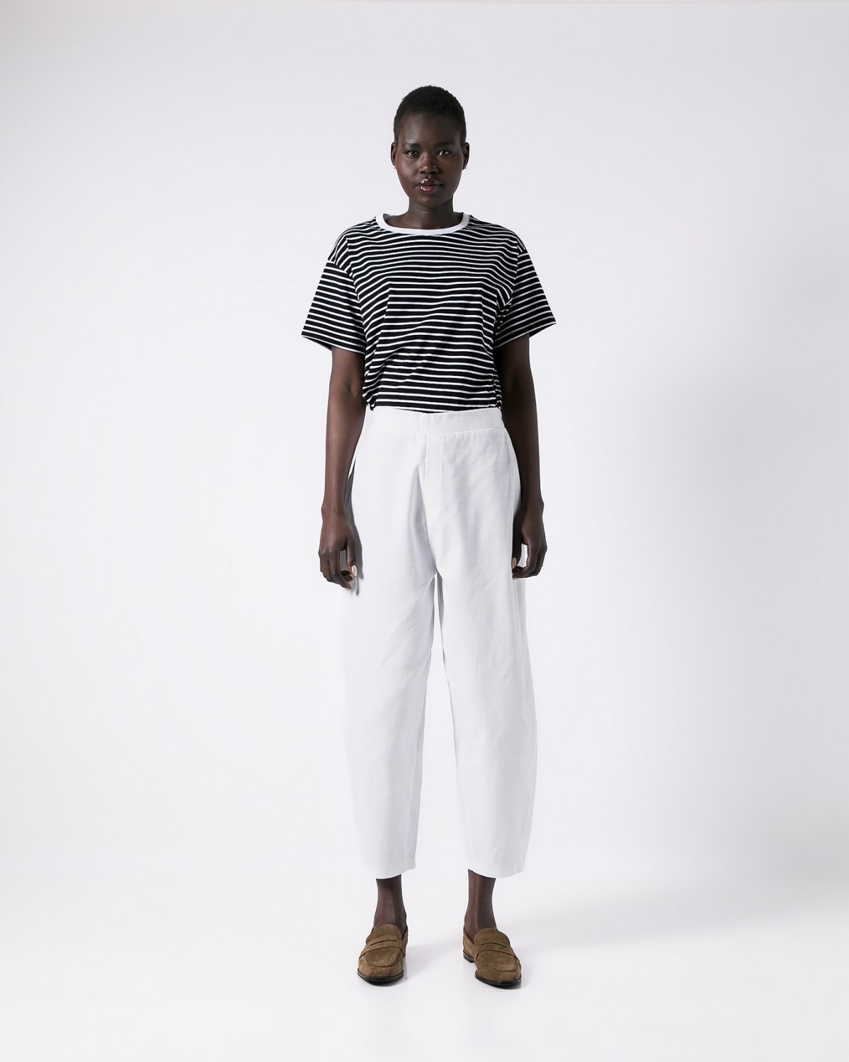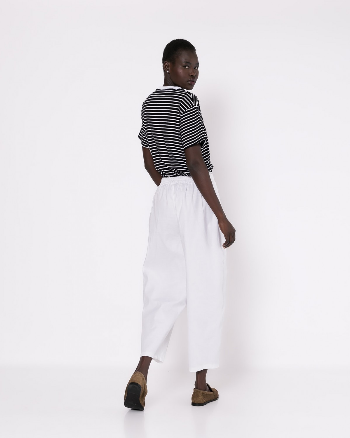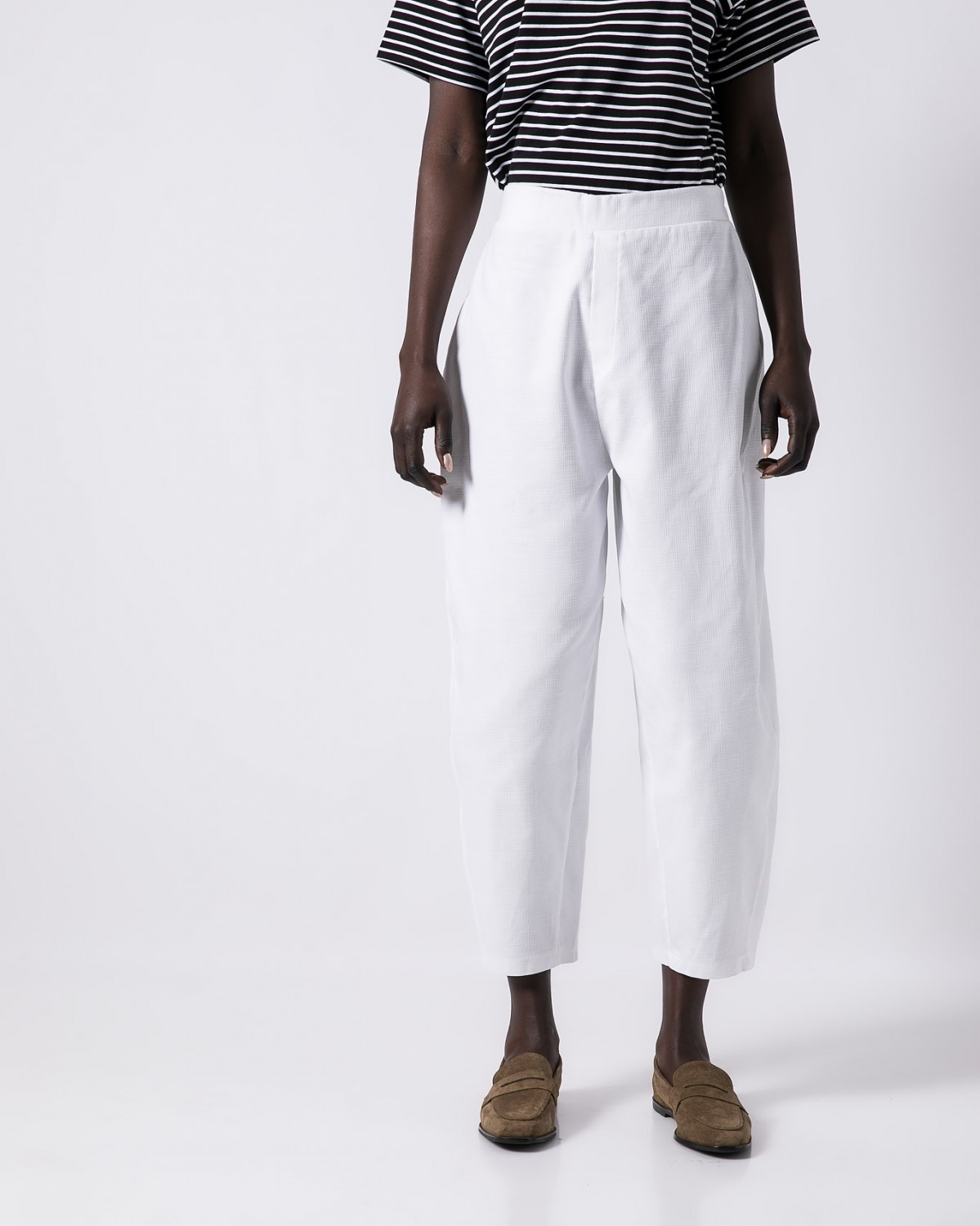 Βαμβακερό παντελόνι carrot fit με λάστιχο στη μέση. Ανάγλυφο βαμβακερό ύφασμα. Χρώμα λευκό.
