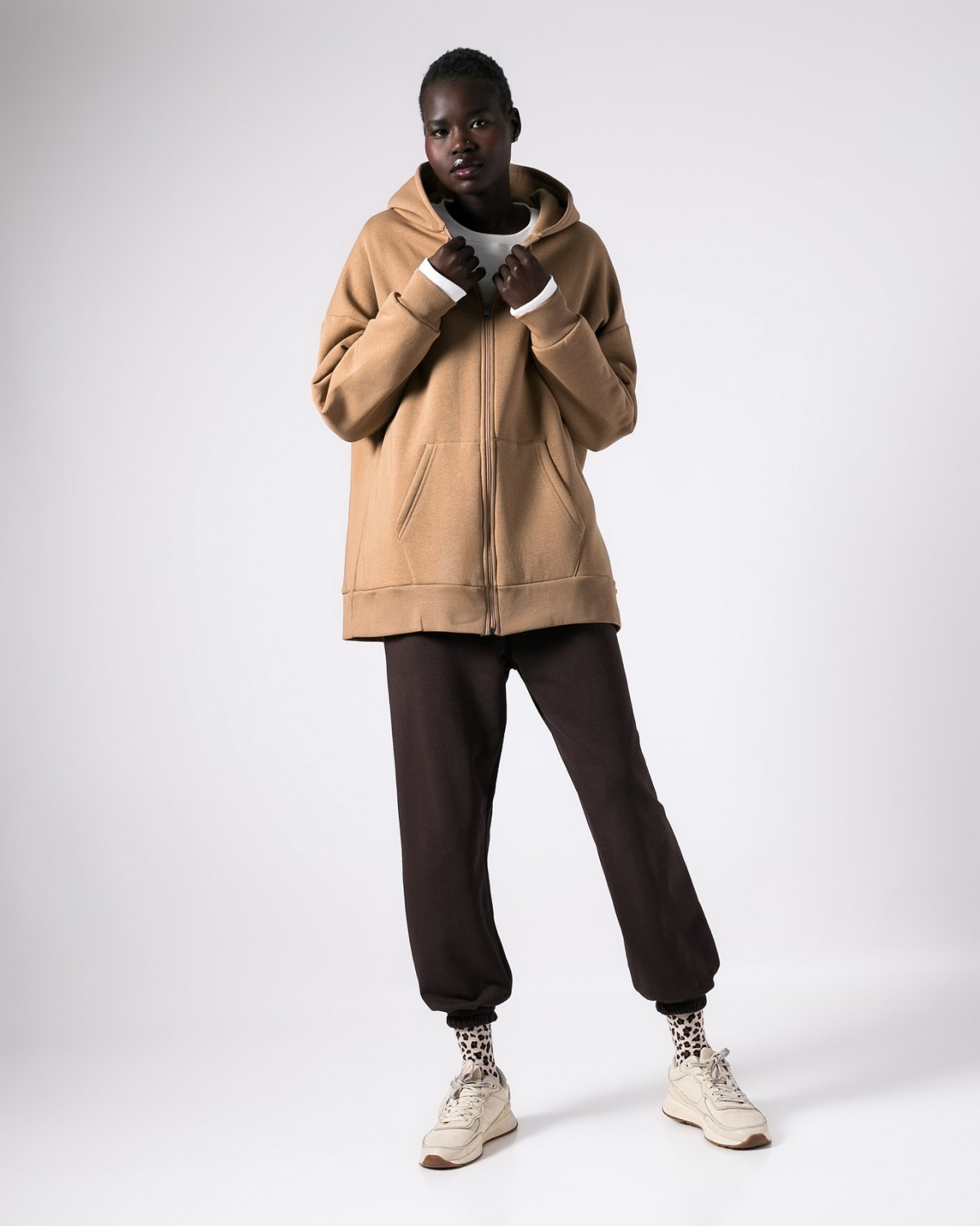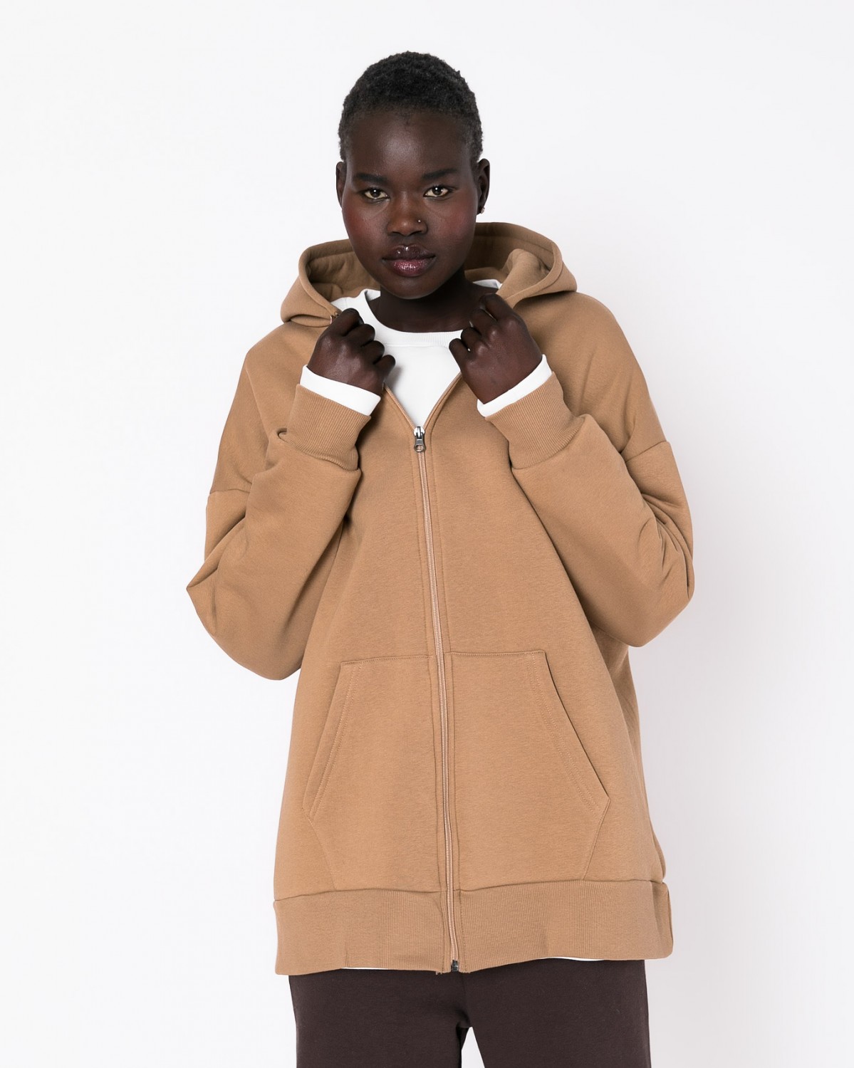 Ζακέτα oversized unisex με φερμουάρ, απαλό ύφασμα, σε χρώμα σκούρο μπεζ. One Size.