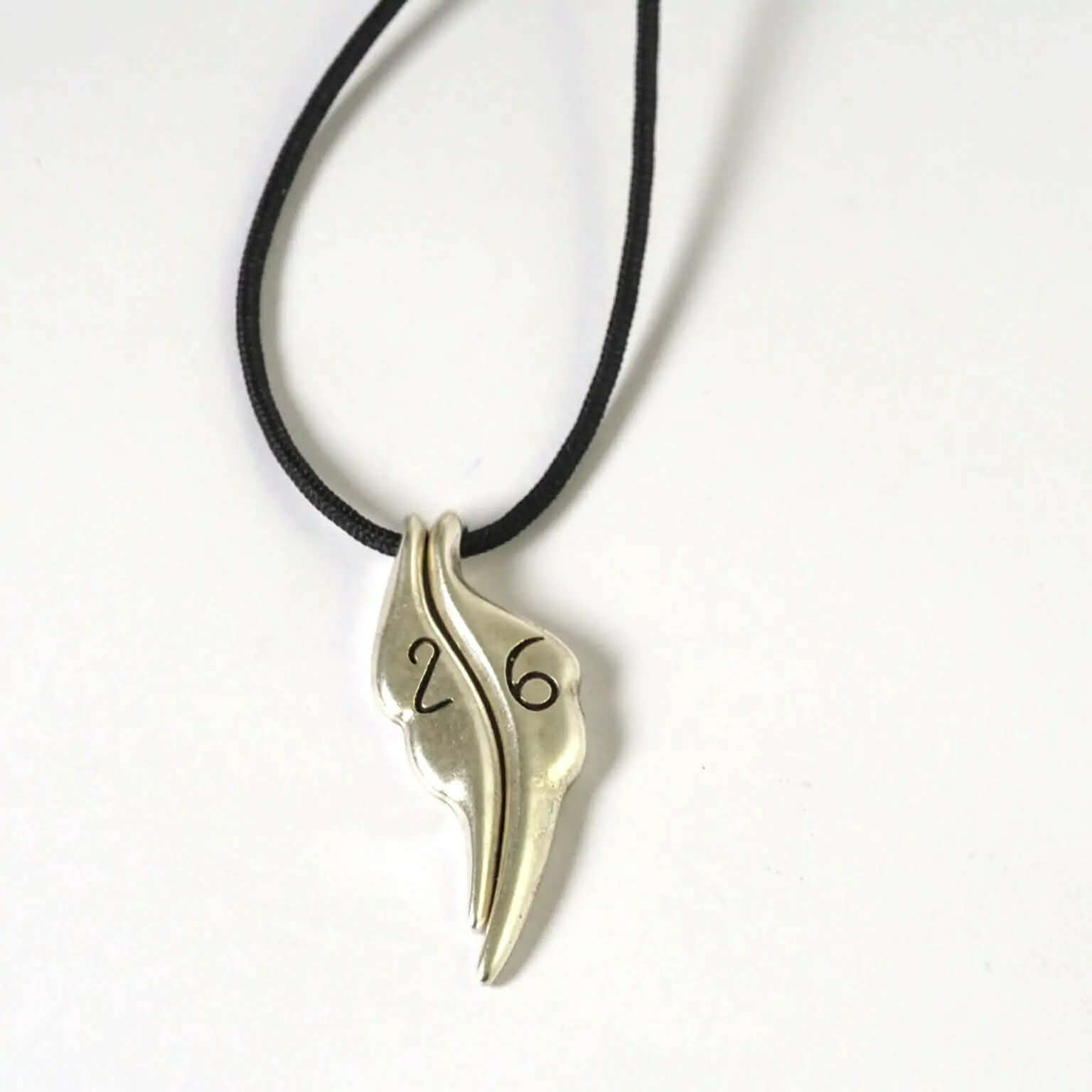 Γούρι κολιέ με κρεμαστό στοιχείο φτερά με επιγραφή “26”. Μαύρο κορδόνι με αυξομείωση μεγέθους.