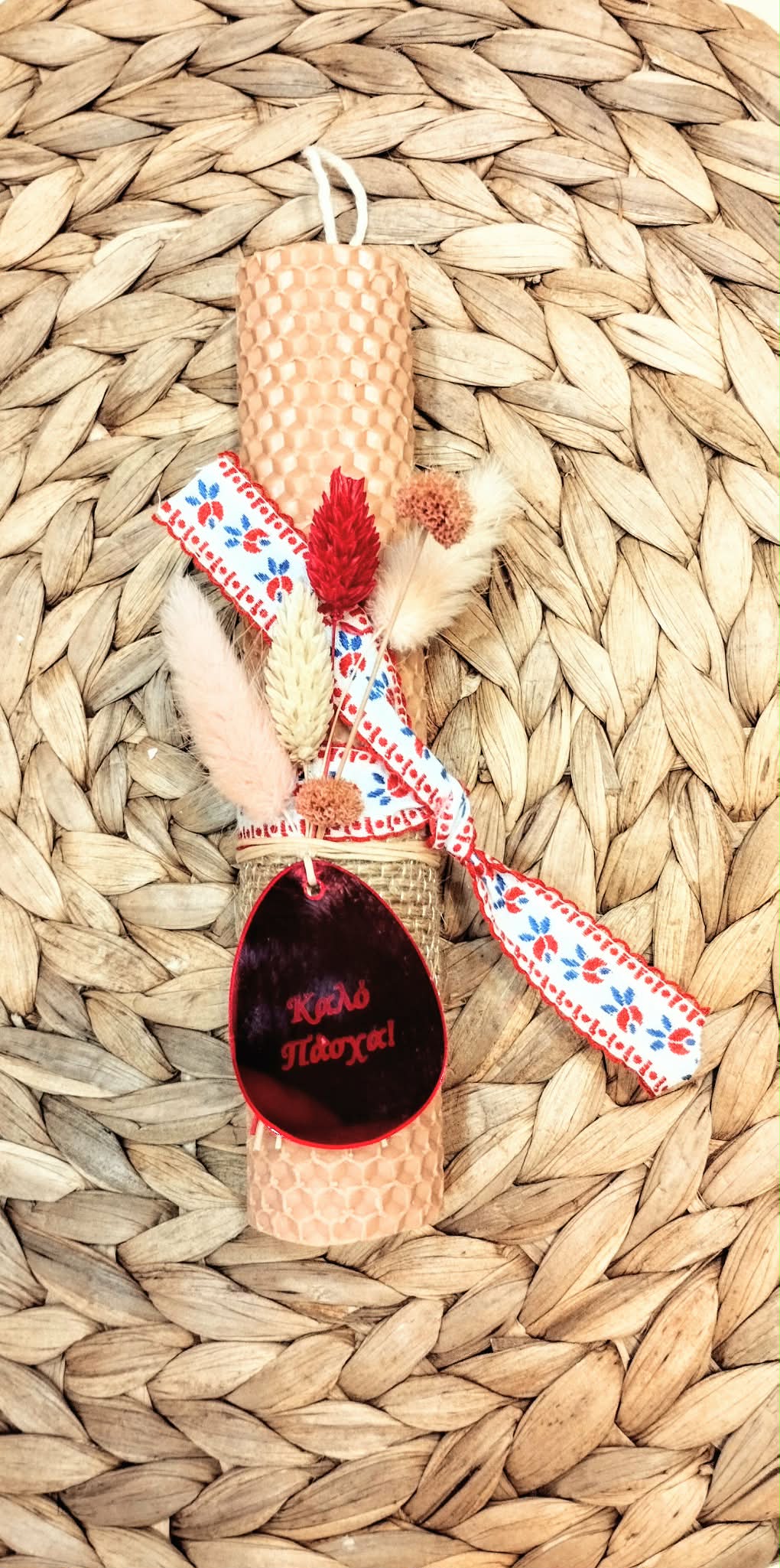 - Διακόσμηση αποξηραμένα φυσικά άνθη με διακοσμητικό κόκκινο αυγό με επιγραφή “Καλό Πάσχα”