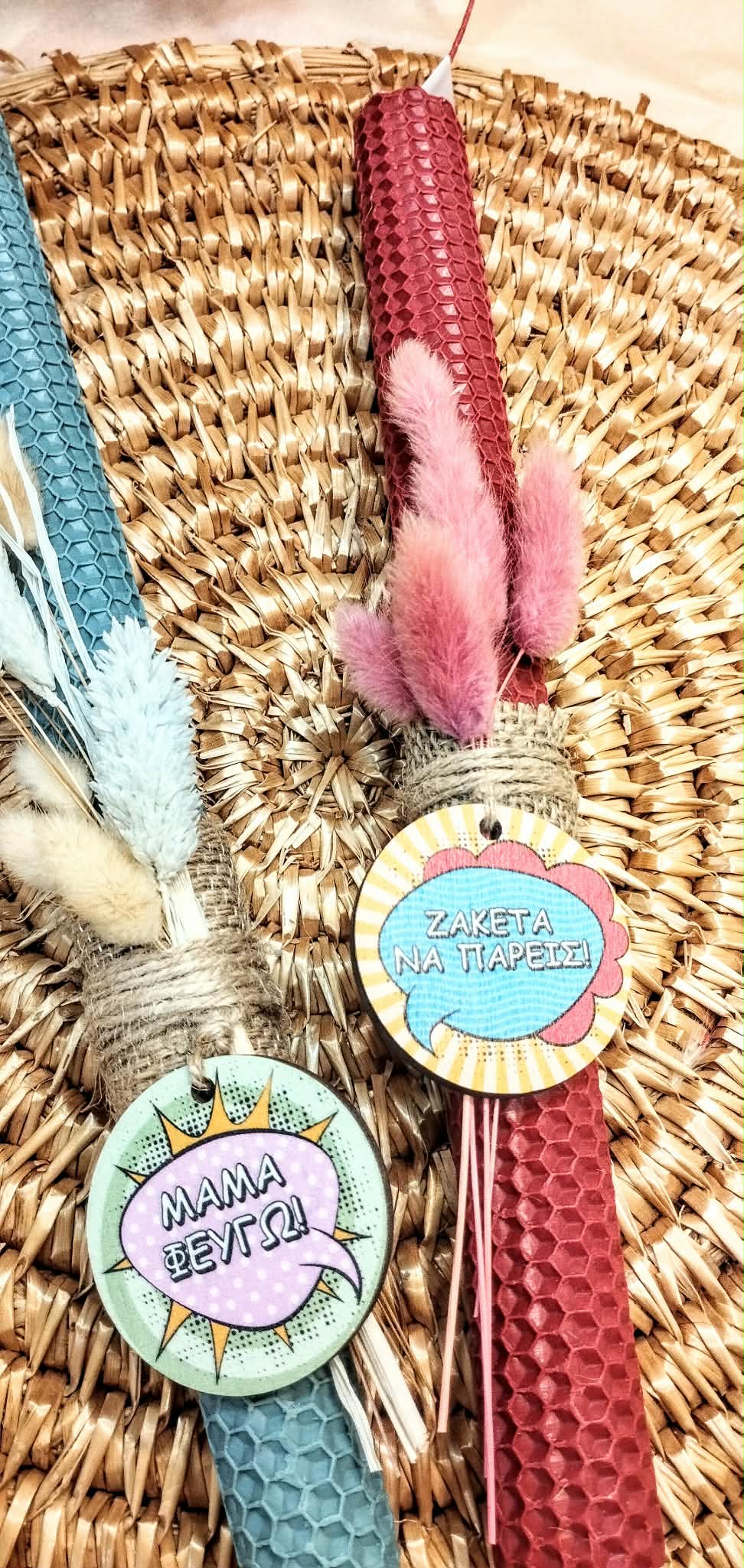 Χειροποίητη λαμπάδα 30 εκ. από φυσικό μελισσοκέρι. Χρώμα σάπιο μήλο, διακοσμημένη με αποξηραμένα άνθη και στοιχείο διακοσμητικό ξύλινο χιουμοριστικό μήνυμα “Ζακέτα να πάρεις” αντιστοιχεί με την λαμπάδα με μήνυμα “Μαμά φεύγω”!