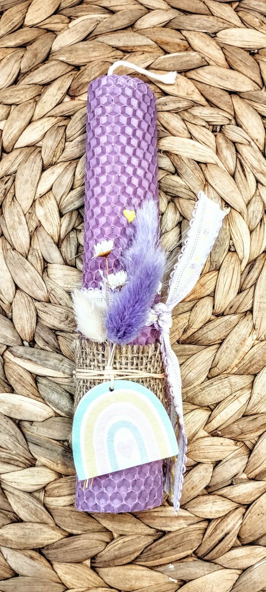 Χειροποίητη λαμπάδα κοντή από φυσικό μελισσοκέρι. Χρώμα λιλά, διακοσμημένη με αποξηραμένα άνθη και ξύλινο κρεμαστό ουράνιο τόξο. Με ζωγραφισμένες λεπτομέρειες κίτρινες mini καρδιές.