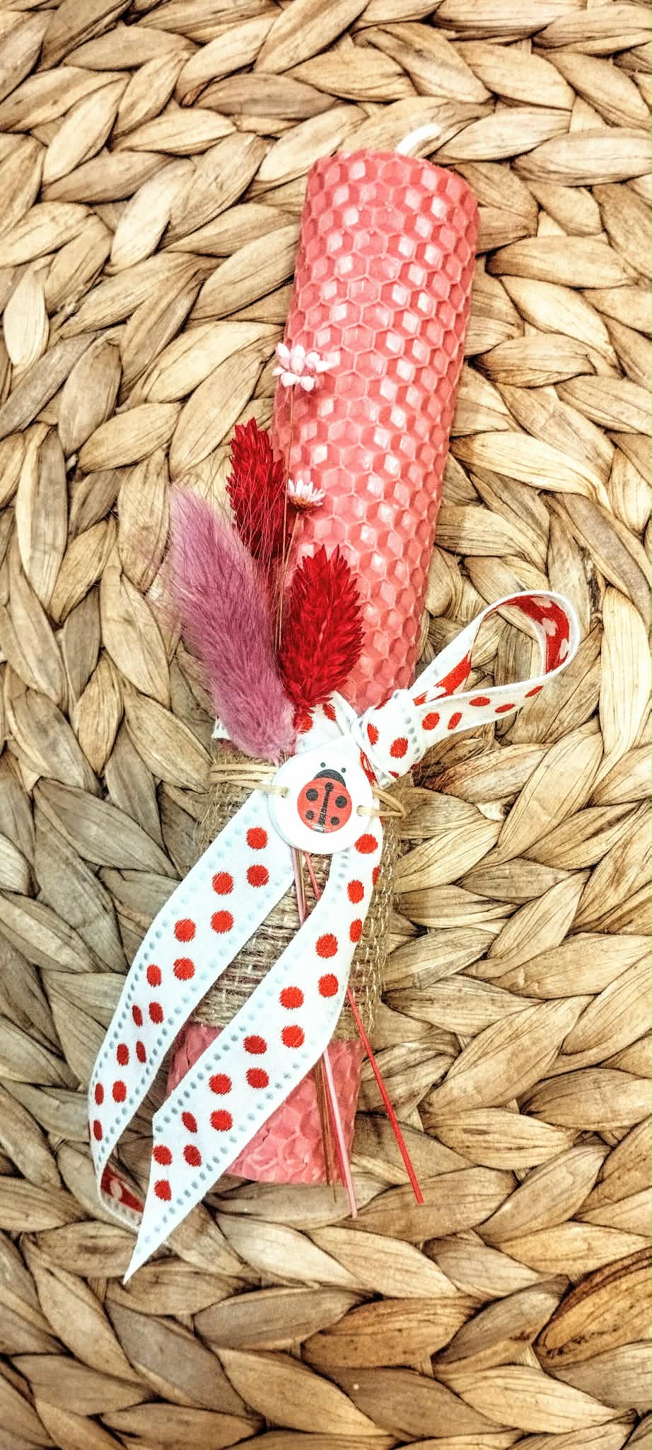 Χειροποίητη λαμπάδα κοντή από φυσικό μελισσοκέρι. Χρώμα ροζ, διακοσμημένη με αποξηραμένα άνθη και στοιχείο πασχαλίτσα.