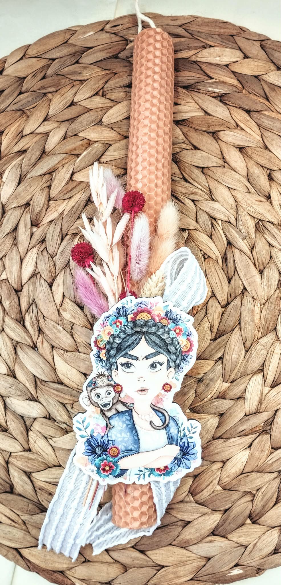 Χειροποίητη λαμπάδα 30 εκ. από φυσικό μελισσοκέρι. Χρώμα σομόν, διακοσμημένη με αποξηραμένα άνθη και στοιχείο μαγνητάκι Frida Kid.