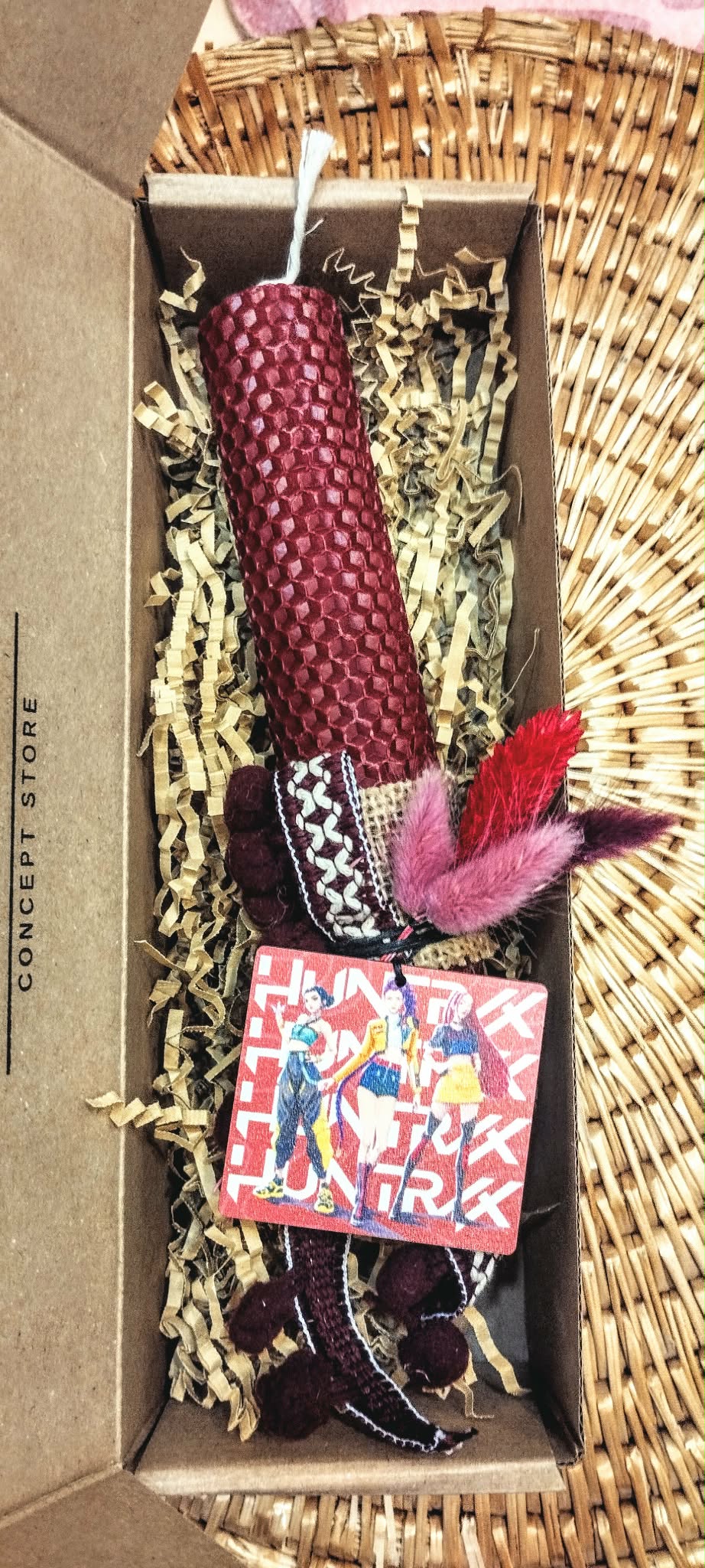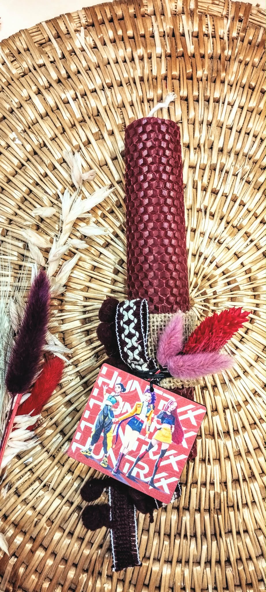 Κοντή Χειροποίητη λαμπάδα από φυσικό μελισσοκέρι. Χρώμα μπορντό διακοσμημένη με φυσικά αποξηραμένα άνθη και κρεμαστό στοιχείο “HUNTRIX”