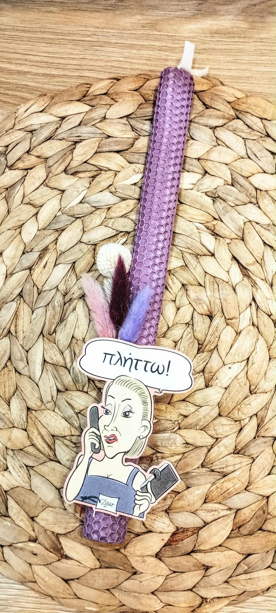 Λαμπάδα μελισσοκέρι-Fun message “Πλήττω”-Χρώμα λιλά