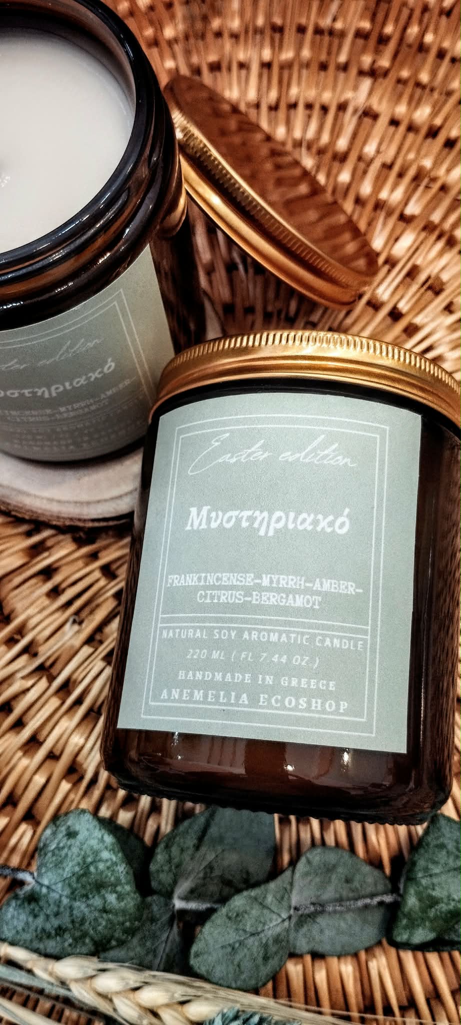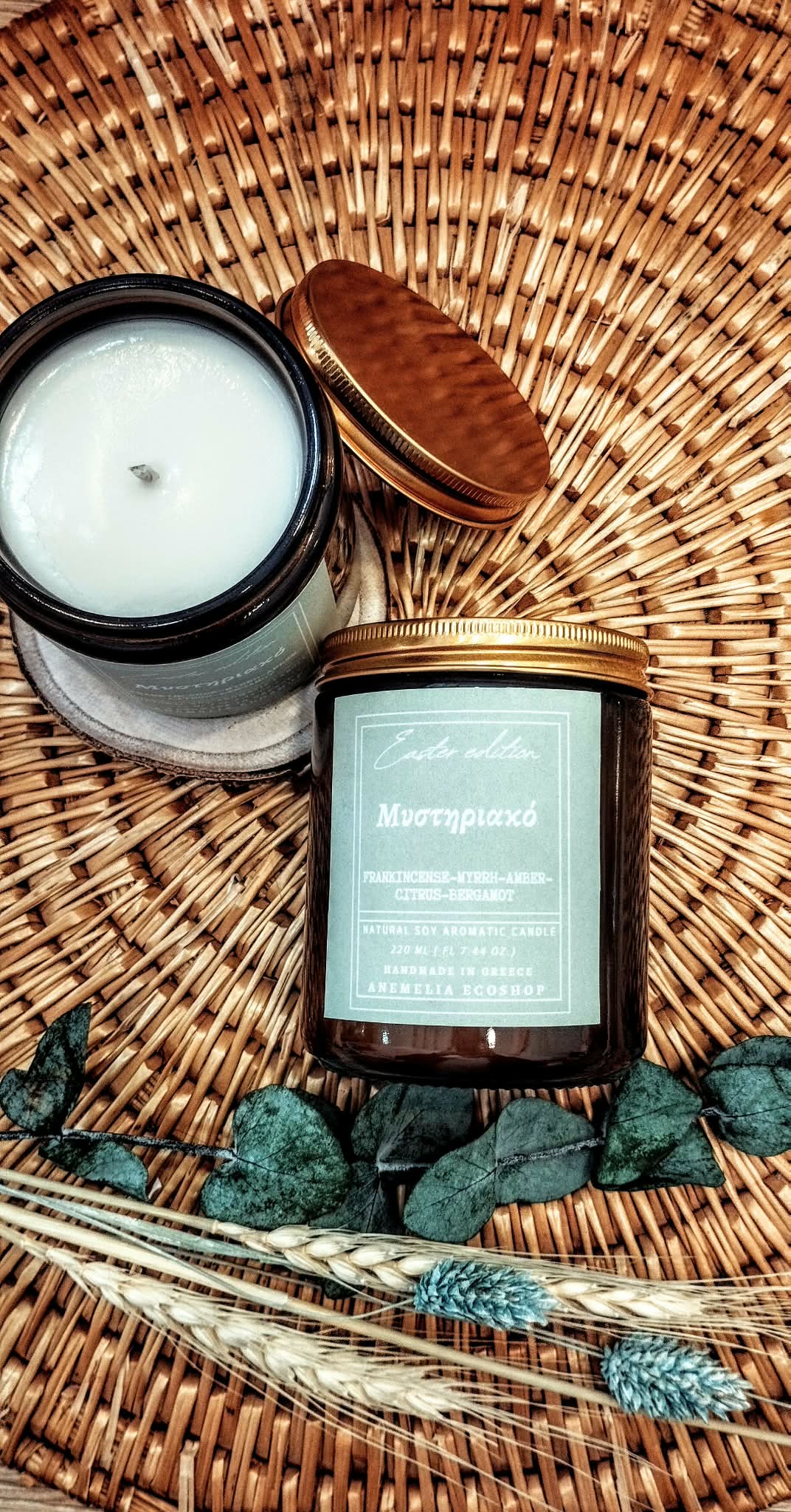 100% Φυσικό χειροποίητο κερί σόγιας με αρωματικές νότες: Λιβάνι – Μύρο – Κεχριμπάρι – Κίτρο -Περγαμόντο