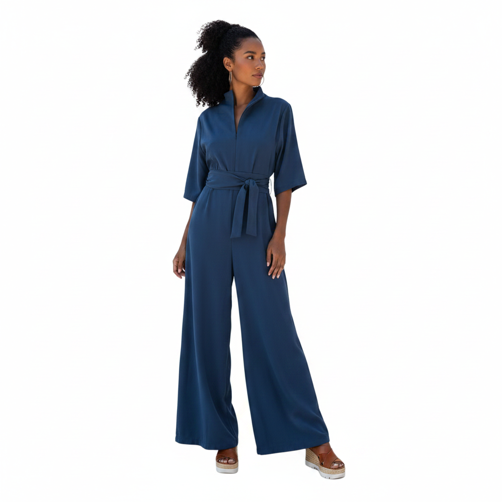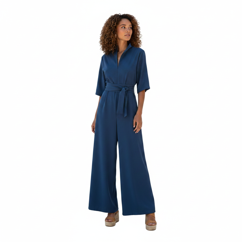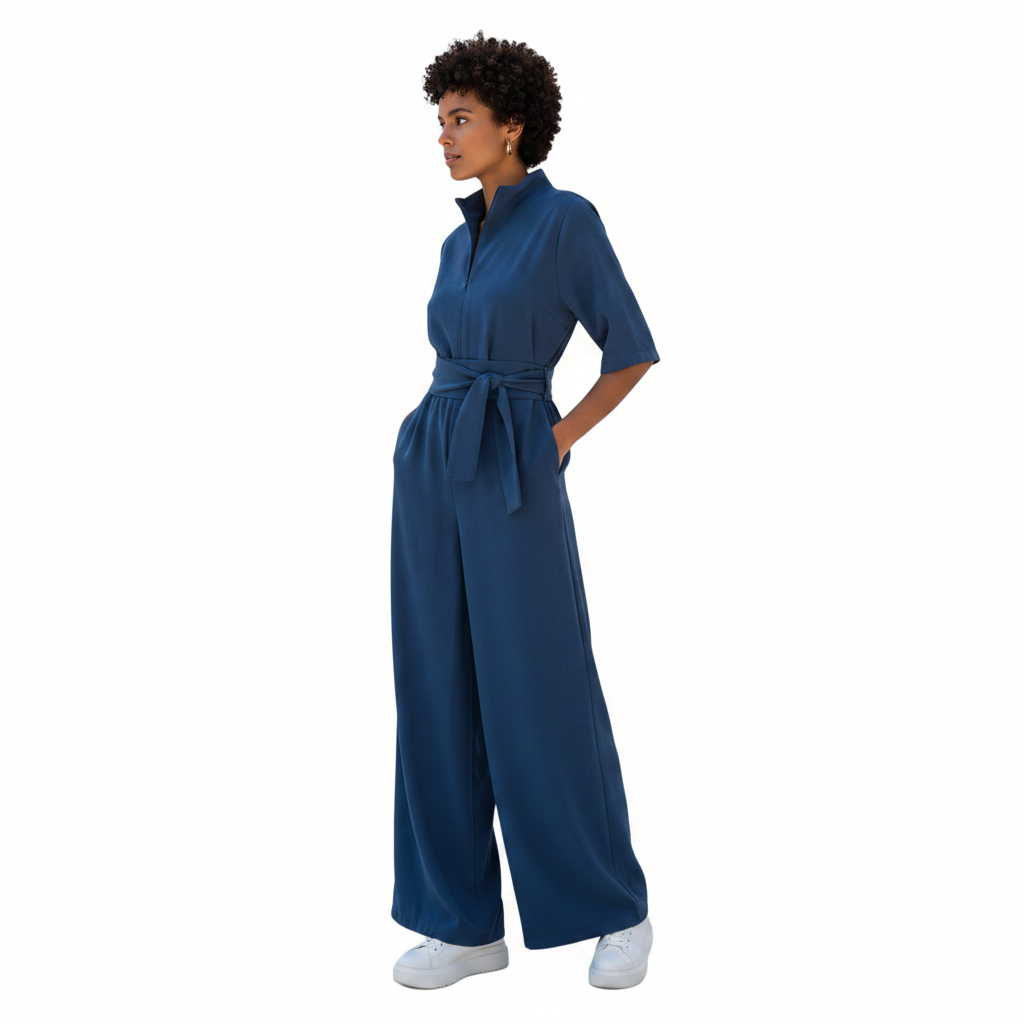 Ολόσωμη φόρμα με φερμουάρ στο μπροστά μέρος. Άνετη εφαρμογή με ξεχωριστή ζώνη για τη μέση. Χρώμα ραφ μπλε.