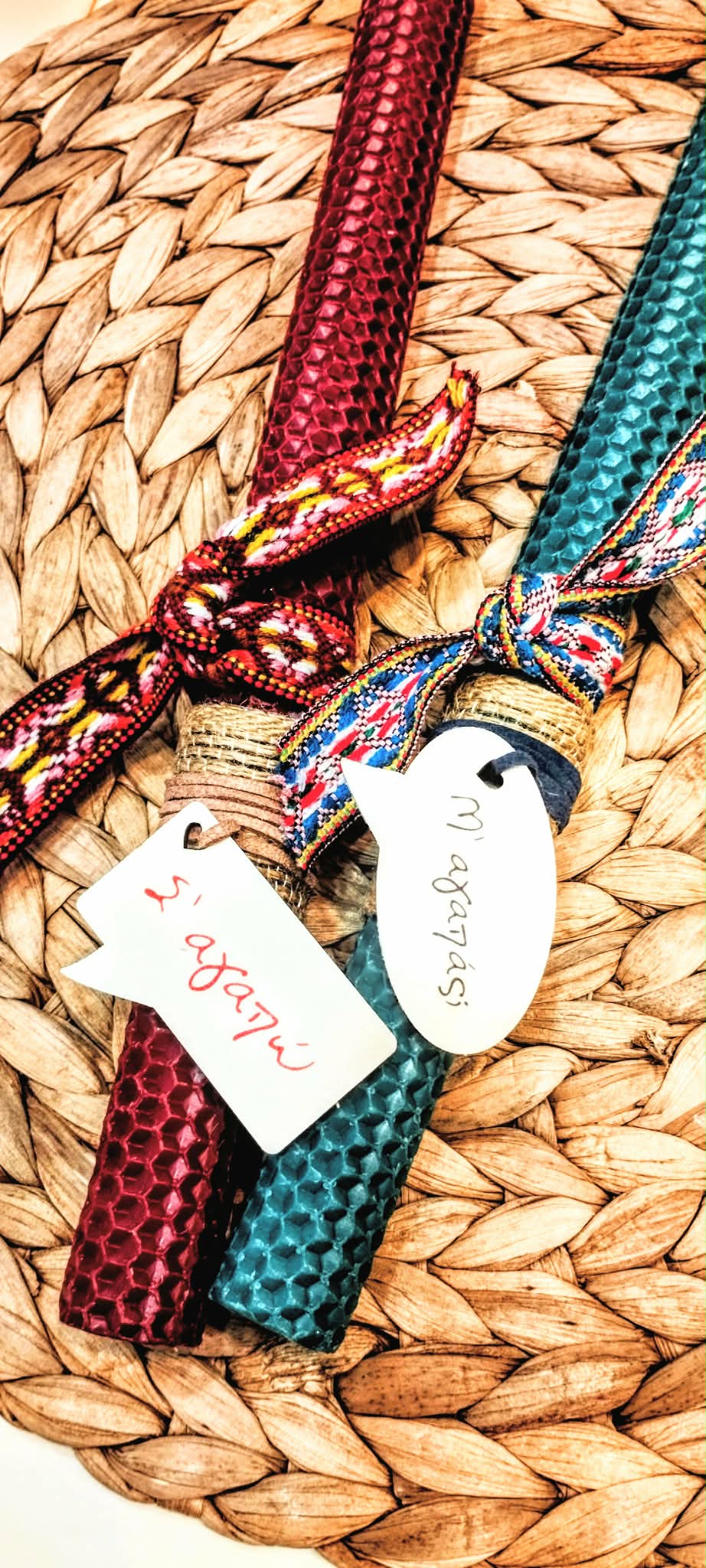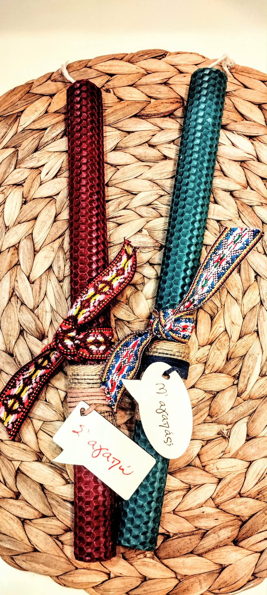 Σετ Χειροποίητες λαμπάδες από φυσικό μελισσοκέρι. Χρώμα μπορντό-πετρόλ διακοσμημένες με boho κορδέλα και ξύλινη ετικέτα Σ’αγαπώ – Μ’αγαπάς.