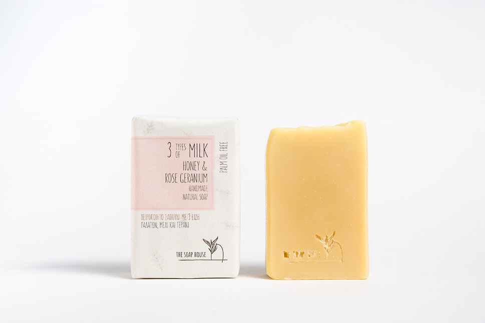 Φυσικό σαπούνι με 3 Είδη Γάλακτος, Μέλι, Γεράνι & Σανδαλόξυλο