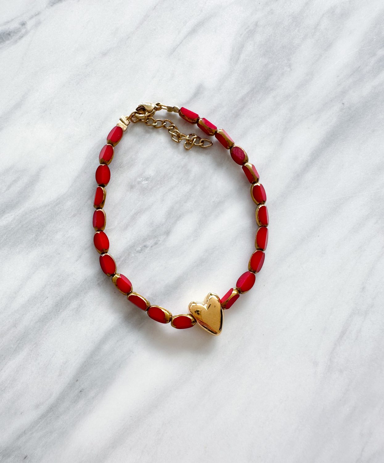 Χειροποίητο βραχιόλι με κόκκινες χάντρες, ρυθμιζόμενο κούμπωμα, με διακοσμητικό στοιχείο “καρδιά” .